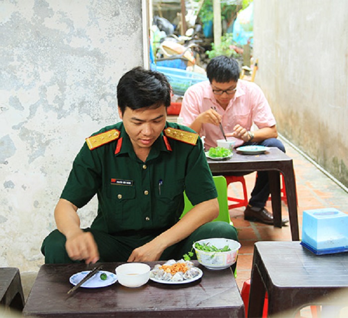 Du khách thưởng thức bánh cuốn Thanh Trì. Ảnh: Eva