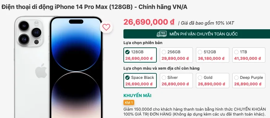 Tính đến sáng ngày 12/4, giá iPhone 14 Pro Max 128GB màu Tím, Đen và Vàng tại Hà Nội được TGDĐ điều chỉnh về mức 26.790 triệu đồng nếu khách mua online, và 27.090 triệu đồng nếu khách mua trực tiếp. Với mức giá này, người mua iPhone 14 Pro Max đã phải chịu lỗ 400.000 đồng chỉ sau vài ngày. Riêng màu bạc có mức giá 27.090 triệu đồng, không áp dụng ưu đãi mua online giá rẻ.Các đối thủ của TGDĐ cũng đã lập tức nắm bắt tình hình để đưa ra điều chỉnh giá phù hợp. Đối thủ chính của TGDĐ là FPT Shop giảm giá về mức tương tự là 26.790 triệu đồng, nhưng áp dụng với tất cả khách hàng mua online lẫn offline. Mức giá này ngoại trừ màu Bạc, có giá 27.090 triệu đồng.