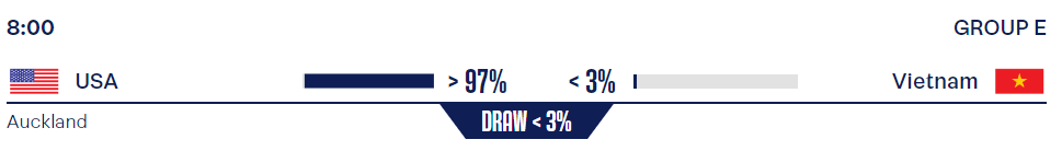 Cơ hội chiến thắng của đội tuyển nữ Mỹ trong trận đấu này là 97%. Cơ hội để đội tuyển Việt Nam hòa hoặc thắng trong trận đấu này cộng lại chỉ bằng 3%. Có nghĩa rằng, đoàn quân của HLV Mai Đức Chung gần như không có cơ hội giành điểm.