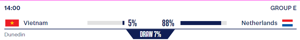 Tương tự, khả năng làm nên bất ngờ của đội tuyển nữ Việt Nam trước Hà Lan rất thấp. Theo tính toán của siêu máy tính, cơ hội chiến thắng của Hà Lan lên tới 88%. Có 7% khả năng trận đấu kết thúc với tỷ số hòa và 5% cơ hội chiến thắng cho đội tuyển Việt Nam.
