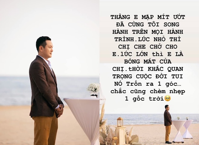 Trên trang cá nhân, em trai Minh Hằng cũng nghẹn ngào viết: "Vẫn thói quen mỗi khi quan trọng nhất của bả là mình đứng xa tít mù khơi". Thay vì đứng cạnh cô dâu chú rể, em trai Minh Hằng chọn cách đứng từ xa để quan sát toàn cảnh khoảnh khắc quan trọng của chị gái.