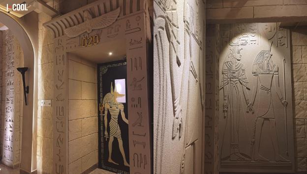 Khi bước vào trong, bạn sẽ có cảm giác mình đang vi vu ở quốc gia khác chứ không đơn thuần là một phòng hát karaoke. Từ sảnh chờ, bức tường, lối đi, phòng hát đến cả tranh ảnh điêu khắc tường đều được xây dựng và thiết kế tỉ mỉ, dựa trên nét đặc sắc của nền văn hóa Ai Cập cổ xưa.