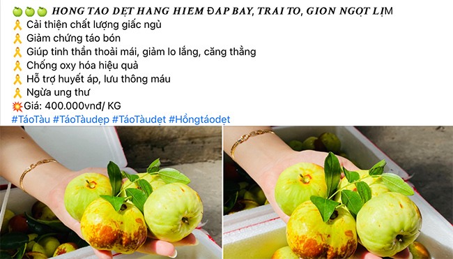Lượn một vòng trên chợ mạng, chung cư, chợ đầu mối…, hồng táo dẹt và tròn được rao bán la liệt. Một số cửa hàng chỉ bán nguyên thùng, nhưng cũng có cửa hàng chia thành hộp nhỏ trọng lượng 500gr để tiện cho khách mua ăn thử. Mỗi bài đăng về hồng táo dẹt, các chị em đều bình luận xôn xao, nhiều người thắc mắc loại quả lạ này, nhiều thực khách đã từng ăn qua loại quả này thì hết lời khen ngợi, cứ vậy người bán hàng chốt đơn lia lịa.