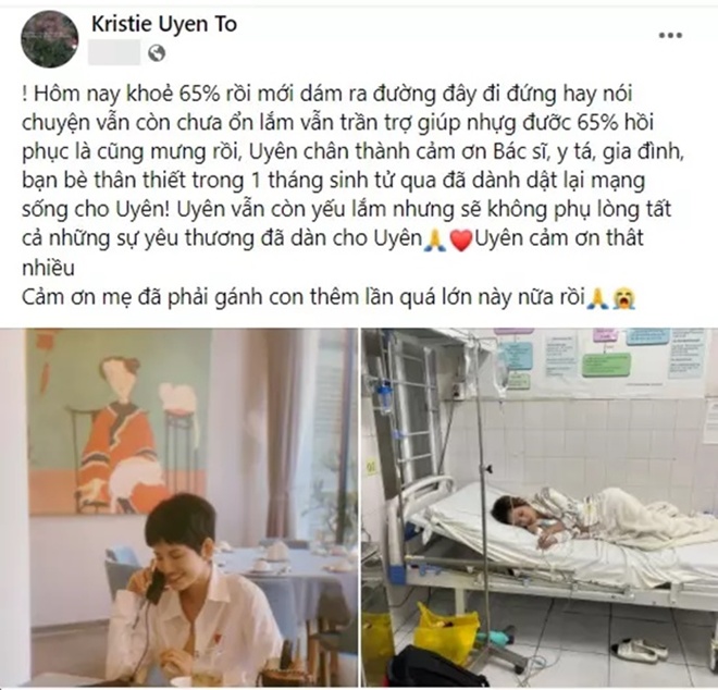 Uyên Tô chia sẻ: "Hôm nay khoẻ 65% rồi mới dám ra đường đây, đi đứng hay nói chuyện vẫn còn chưa ổn lắm, vẫn cần trợ giúp nhưng được 65% hồi phục là cũng mừng rồi. Uyên chân thành cảm ơn bác sĩ, y tá, gia đình, bạn bè thân thiết trong một tháng sinh tử qua đã giành giật lại mạng sống cho Uyên!