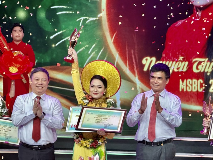 Ông Dương Anh Đức - Phó chủ tịch UBND TP HCM (trái), ông Cao Anh Minh - Tổng Giám đốc HTV trao giải "huông vàng vọng cổ" lần thứ 18 - 2023 cho Nguyễn Thị Như Ý