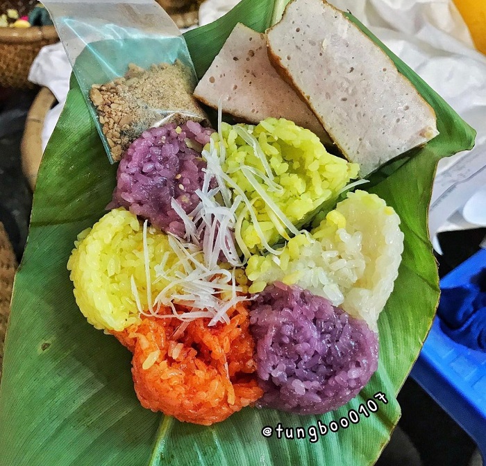 Món xôi ngũ sắc có 5 màu xanh, vàng, tím, trắng và đỏ. Ảnh: baotnvn