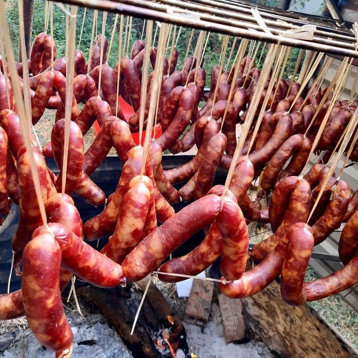 Lạp xưởng gác bếp: Lạp xưởng Yên Bái được làm từ thịt heo, tẩm ướp gia vị đậm đà, được treo trên lửa hồng nên sẽ thấy mùi khói đặc trưng. Lạp xưởng có màu đỏ sẫm, hương vị đậm đà, có thể dùng để ăn chơi hoặc ăn kèm với cơm trắng nóng hổi cũng rất ngon.