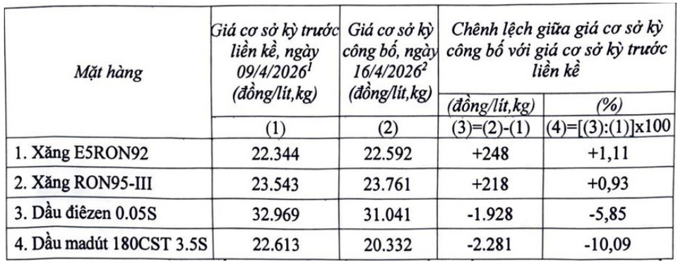 Theo điều hành của Liên Bộ Công Thương - Tài chính từ 0h ngày 16/4, giá xăng dầu trong nước có diễn biến trái chiều khi các mặt hàng xăng tăng nhẹ, trong khi giá dầu giảm mạnh so với kỳ điều hành ngày 9/4.