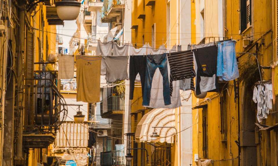 Tại trung tâm Naples, những con phố dài thường được giăng kín dây phơi giữa các tòa nhà, võng xuống dưới sức nặng của quần áo ẩm. Mọi khoảng không phía trên đều tràn ngập vải vóc đa sắc, tạo thành những “cổng chào” nối tiếp giữa nhịp sống đô thị.