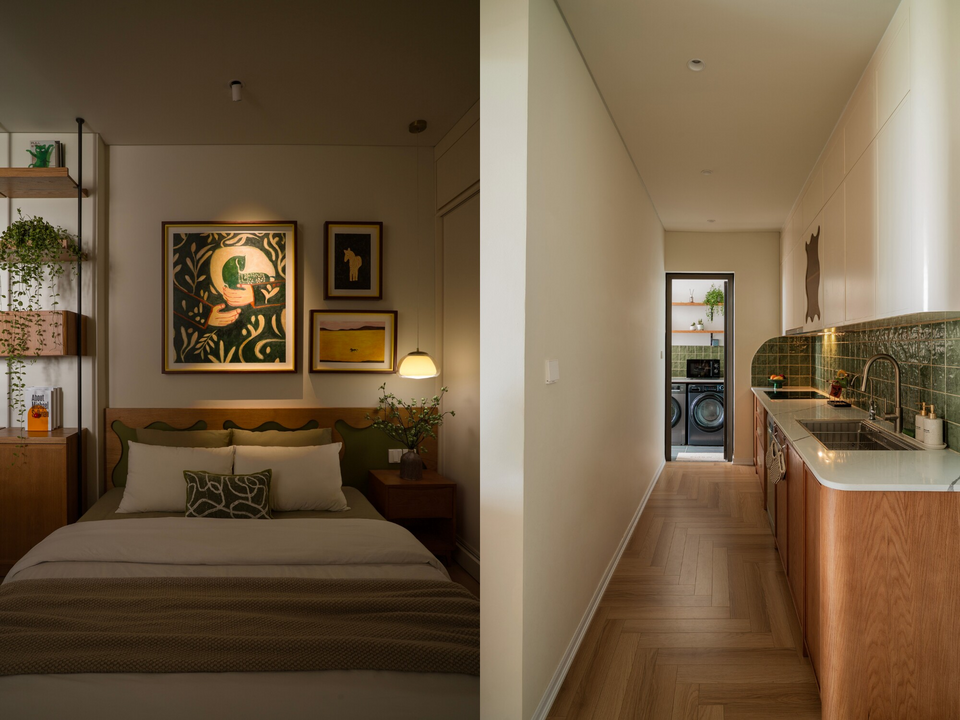 Căn hộ 77m² gồm hai phòng ngủ, khu bếp chữ I và hai nhà vệ sinh. Tổng thể không gian nổi bật nhờ sự kết hợp hài hòa giữa gam màu gỗ ấm áp và những đường cong mềm mại. Mỗi góc nhà đều được tính toán kỹ lưỡng để vừa đảm bảo thẩm mỹ, vừa tối ưu công năng sử dụng.
