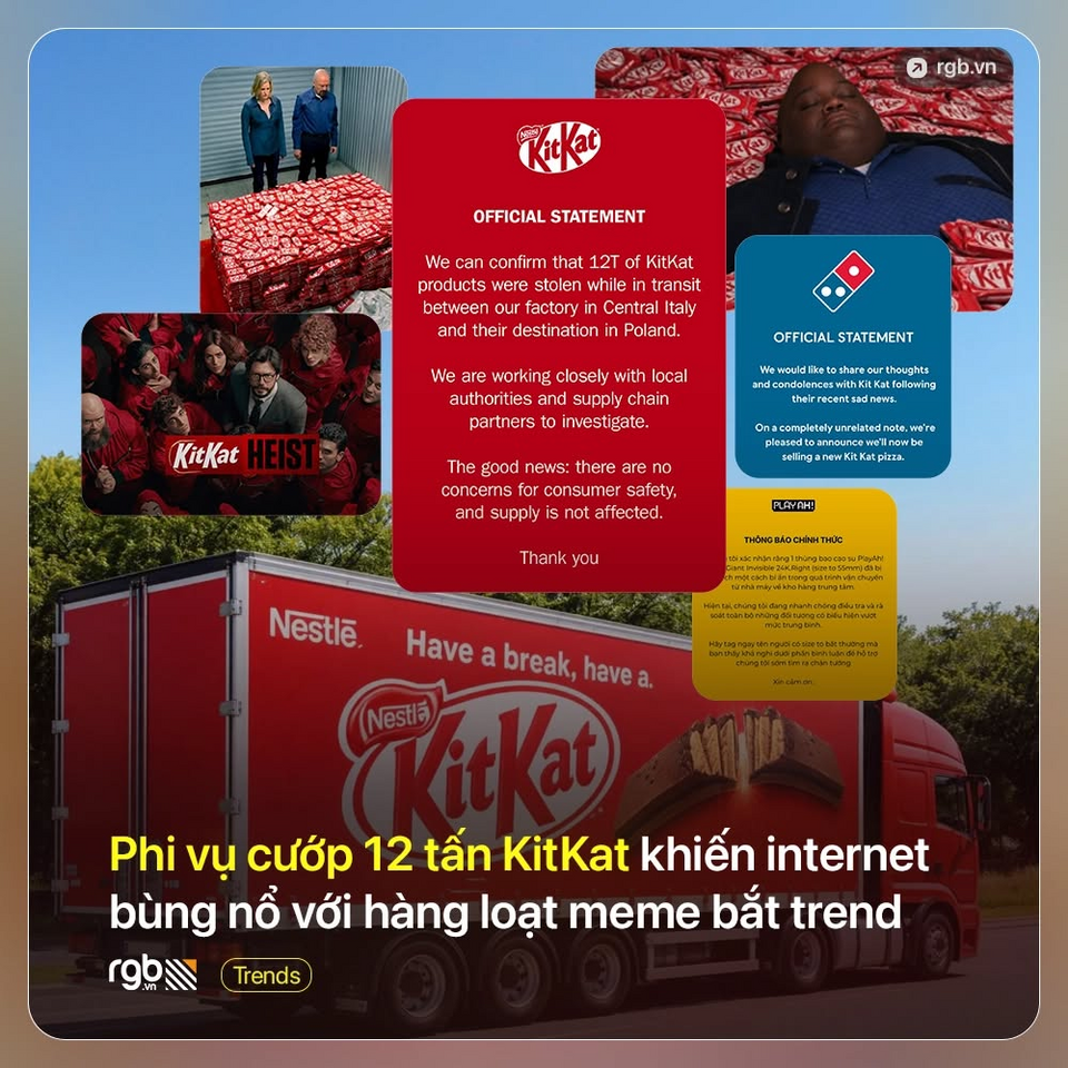 Trộm tiền, trộm bạc thấy nhiều, nhưng thật hy hữu với trường hợp trộm kẹo socola KitKat của nhóm cướp như lần này tại Ý. Tận dụng sự bàn tán của truyền thông, nhiều thương hiệu trong và ngoài nước đã nhanh chóng "bắt trend", biến tấu từ vụ việc KitKat theo hướng hài hước như một hình thức quảng bá cực hóm hỉnh.