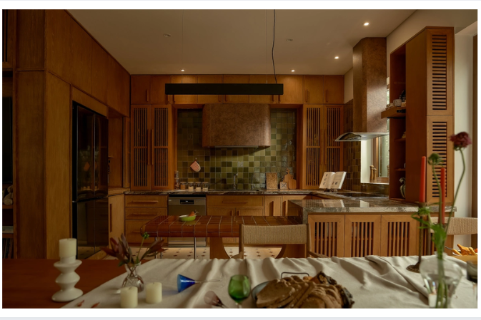 Khu bếp sử dụng hệ tủ gỗ tự nhiên kết hợp mặt đá granite tối màu, tường ốp gạch men xanh rêu với nhiều sắc độ. Cửa sổ phía sau mở ra mảng xanh, đưa ánh sáng và cảnh quan tự nhiên vào khu vực nấu nướng. Nối liền bếp và phòng ăn là quầy bar ốp gạch gốm nâu đỏ, vừa đóng vai trò bề mặt thao tác, vừa là ranh giới mềm giữa hai không gian.