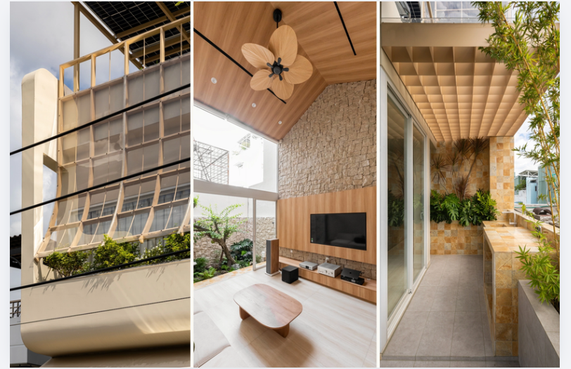 Hệ vỏ bọc này hoạt động như một lớp lọc khí hậu: che chắn bức xạ ánh nắng mặt trời, tăng thông gió tự nhiên, đồng thời tạo khoảng riêng tư cho các tầng sinh hoạt mà không làm tối không gian bên trong.