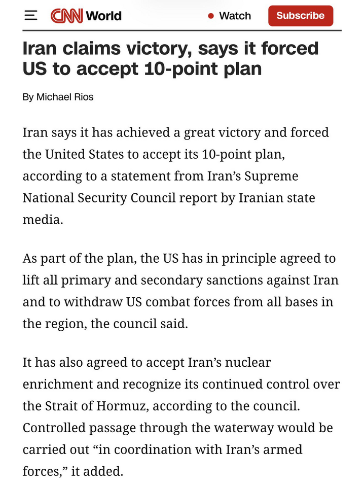 CNN đưa tin Iran tuyên bố chiến thắng, ép Mỹ chấp nhận 10 điểm yêu sách của Iran như sau: