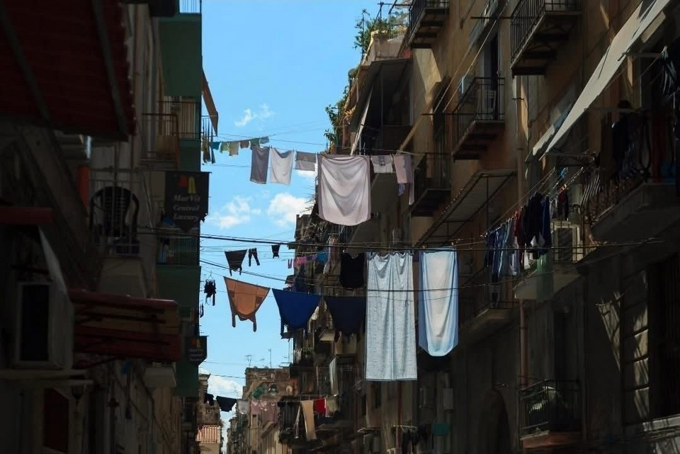 Tại trung tâm Naples, những con phố dài thường được giăng kín dây phơi giữa các tòa nhà, võng xuống dưới sức nặng của quần áo ẩm. Mọi khoảng không phía trên đều tràn ngập vải vóc đa sắc, tạo thành những “cổng chào” nối tiếp giữa nhịp sống đô thị.