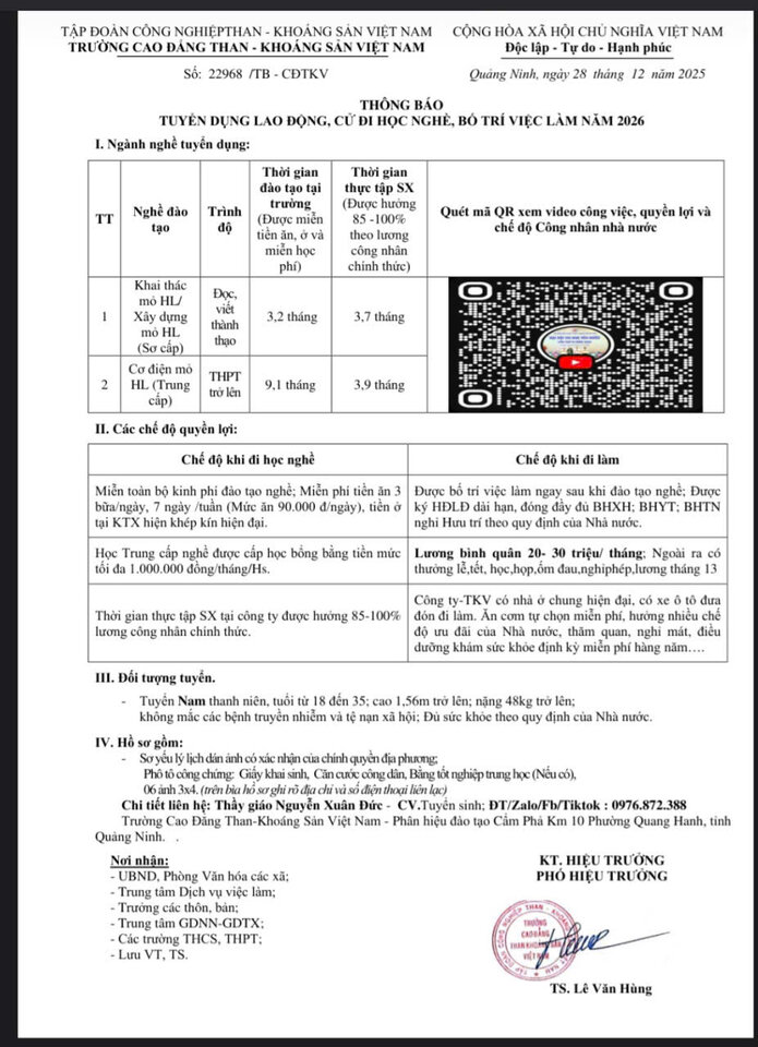 TKV- Tuyển lao động Nam 18- 35 Tuổi biết đọc; biết viết là được, đào tạo ngắn hạn miễn phí 100%; có việc làm ổn định ngay trong các Công ty Nhà nước tại Quảng Ninh; Lương 20- 30 triệu/tháng, đóng đầy đủ BHXH, BHYT, BHTN; liên hệ Thầy Đức ĐT/Zalo/Tiktok: 0976. 872. 388.